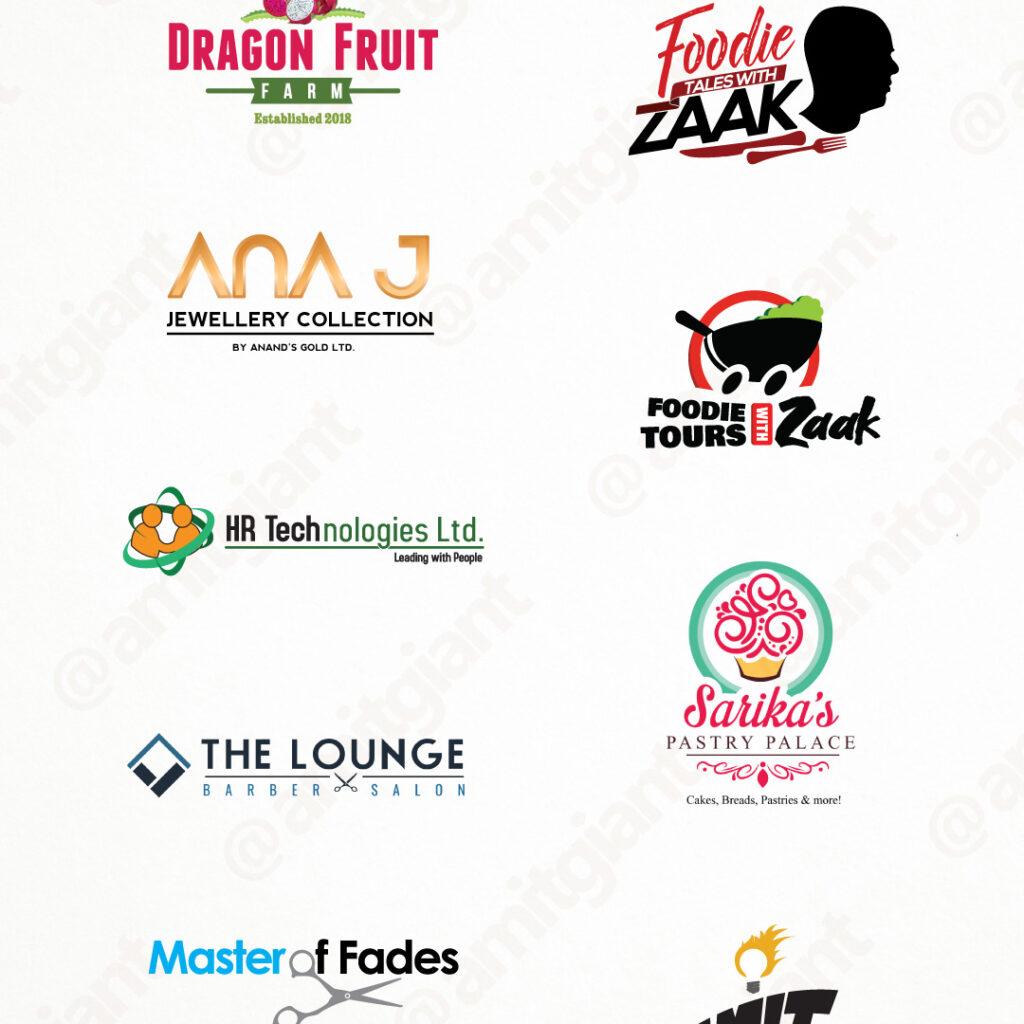 Logo Concept and Designs from various clients, such as Pioneers Dragon Fruit Farm, Foodie Tales with Zaak, TheJewel Box, Senor Gyro, Green Tree, H.R. Technologies Ltd., Sarika Pastry Palace, The Lounge Barber Salon, EASE TT, Anand’s Gold & Diamond Coll., Master of Fades & our very own Amit Productions.